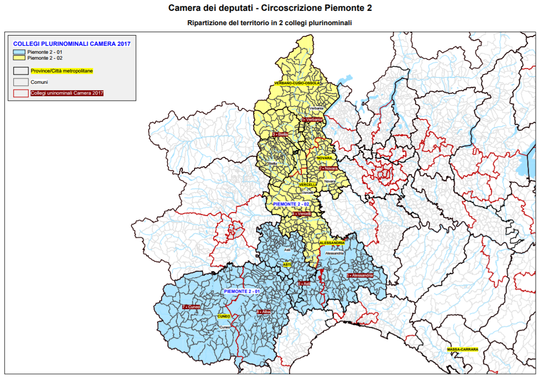 La circoscrizione Piemonte 2 conta invece 8 collegi uninominali, sempre disegnati sulla base dei collegi del Senato del Mattarellum. Questi si rifanno alle province piemontesi “fuori” Torino, a cui va ad aggiungersi il collegio di Alba, che aggrega più comuni e più abitanti. Al contrario, è quello di Biella a risultare il più piccolo in termini di popolazione (pur contenendo alcuni comuni vercellesi). Anche qui, poi, i collegi plurinominali sono 2. Nel primo, a cui afferiscono i collegi di Alessandria, Asti, Cuneo e Alba, vengono assegnati 8 seggi. Nel secondo, corrispondente al resto del territorio, 6 seggi. Tale differenza è dovuta al diverso numero di abitanti tra i due collegi, il cui scarto supera i 100.000, come mostrato dalle seguenti tabelle: