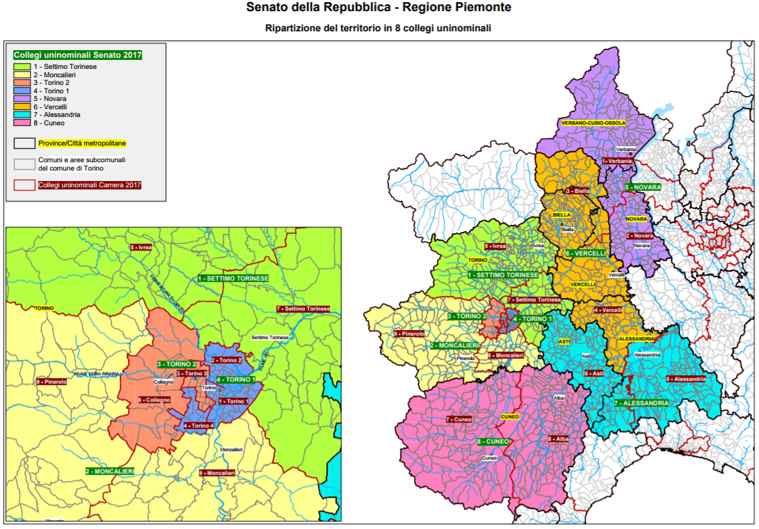 Al Senato, come si sa, la circoscrizione è unica su base regionale. Sono stati individuati 8 collegi uninominali: quattro nella provincia di Torino (di cui due nella città capoluogo, più Collegno) e quattro nel resto della regione. I collegi plurinominali sono due, ognuno dei quali assegna 7 seggi. Ancora una volta, uno corrisponde alla provincia di Torino, mentre l’altro comprende le restanti province. Il collegio uninominale più abitato è quello di Torino città, mentre il più piccolo risulta essere quello di Biella-Vercelli, come mostrato dalle tabelle seguenti: