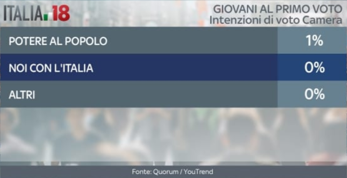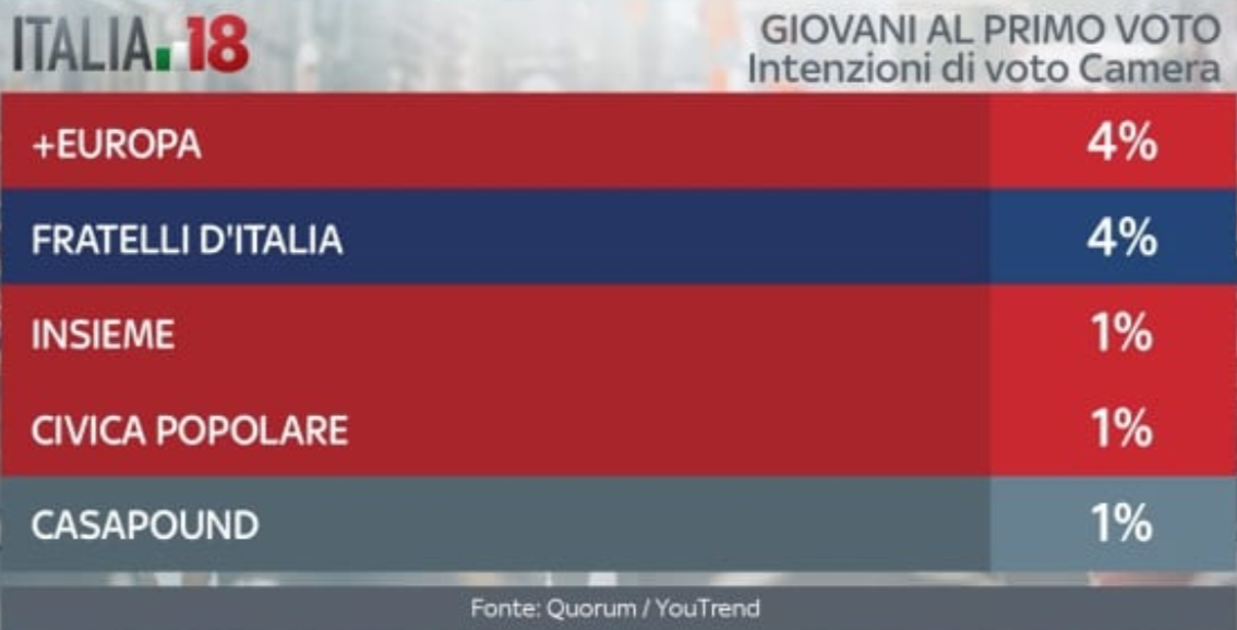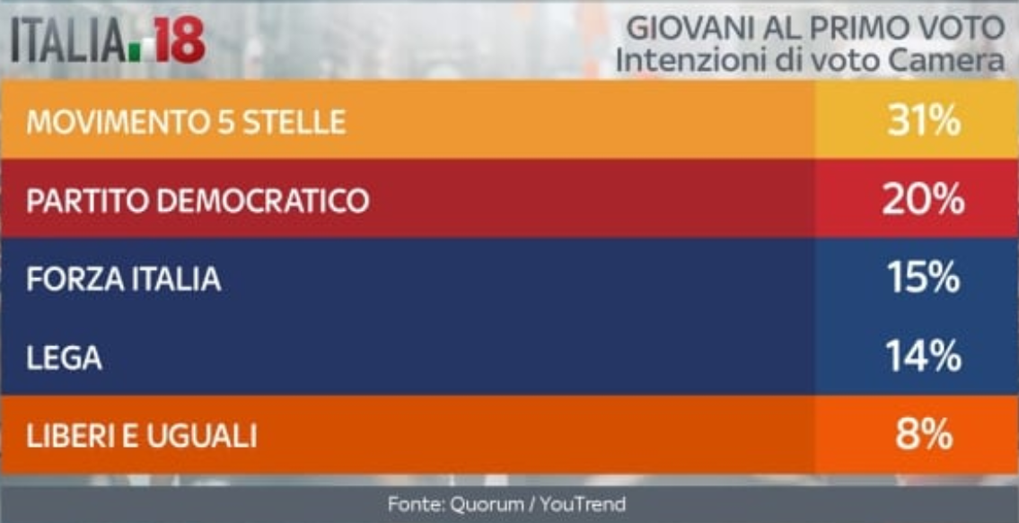 Nelle intenzioni di voto dei giovanissimi, tra coloro che voteranno per la prima volta il prossimo 4 marzo per il rinnovo della Camera dei Deputati, il Movimento 5 Stelle è saldamente il primo partito con il 31% dei consensi. Segue il Pd con il 20%, ma in generale la coalizione di centrosinistra non sembra godere di un forte appoggio, salvo l’exploit di +Europa al 4%: in totale si ferma al 26%. Una causa potrebbe essere anche il consenso di Liberi e Uguali in questa fascia dell’elettorato, che arriva all’8%. Prima coalizione, invece, è il centrodestra, che con il 33% totale supera il Movimento 5 Stelle. All’interno, i voti sono così distribuiti: Forza Italia 15%, Lega 14%, Fratelli d’Italia 4%, mentre Noi con l’Italia non è pervenuta. Infine gli indecisi, che sono ancora il 16%, mentre i ragazzi che si asterranno saranno ben il 40%, un dato certamente significativo.