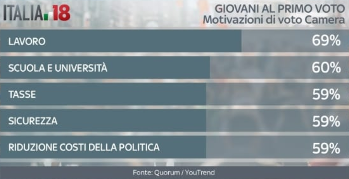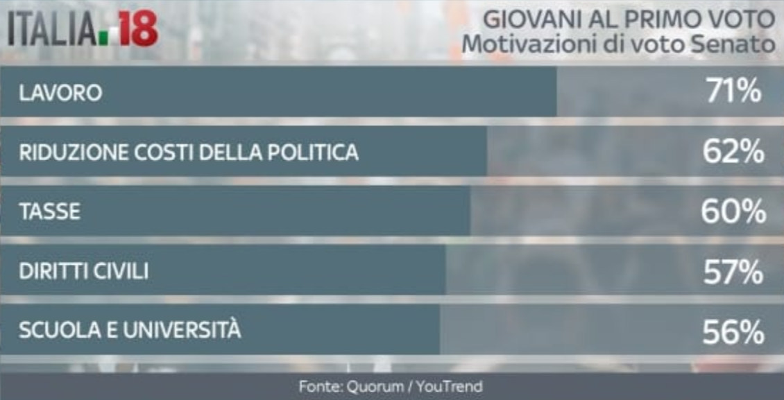 Quali sono le cinque issue che i giovani al primo voto alla Camera ritengono più importanti quando andranno a votare? Su tutte il lavoro con il 69%, ma anche scuola e università (60%). Poco più sotto, al 59%, tasse, sicurezza e la riduzione dei costi della politica. Gli stessi temi sono prioritari anche per i giovani al loro primo voto al Senato, anche se con percentuali differenti. Prima fra tutte rimane la questione lavoro con il 71%. Segue la riduzione dei costi della politica con il 62% e, subito dietro, le tasse al 60%. Al quarto posto rientrano i diritti civili con il 57% e chiude la top five il tema della scuola e università (56%).