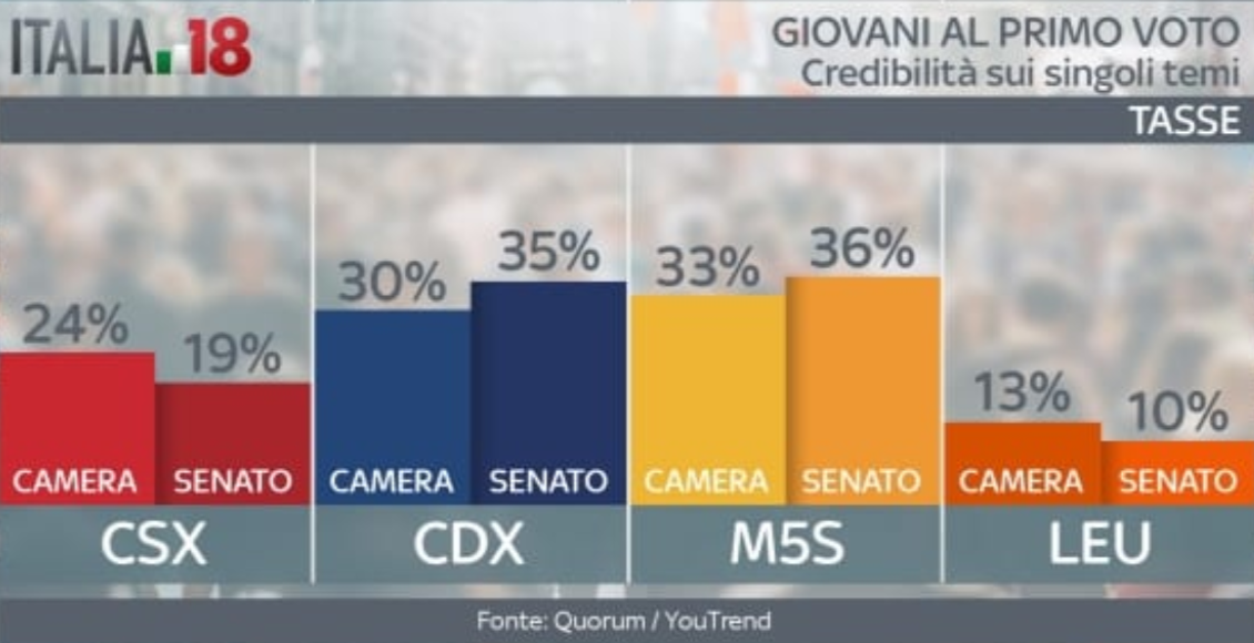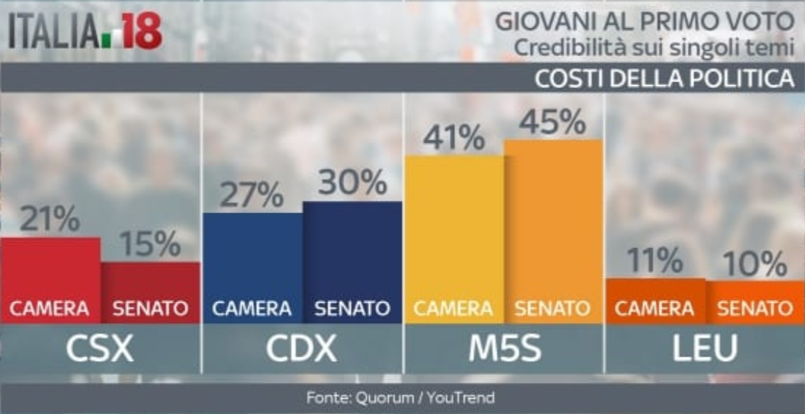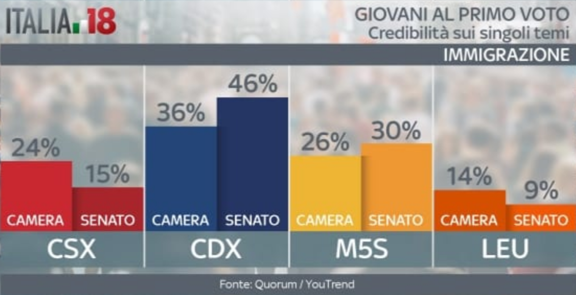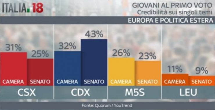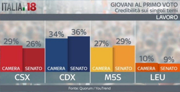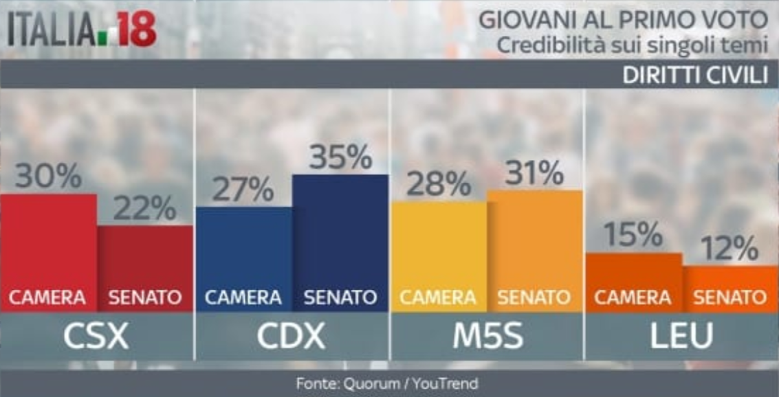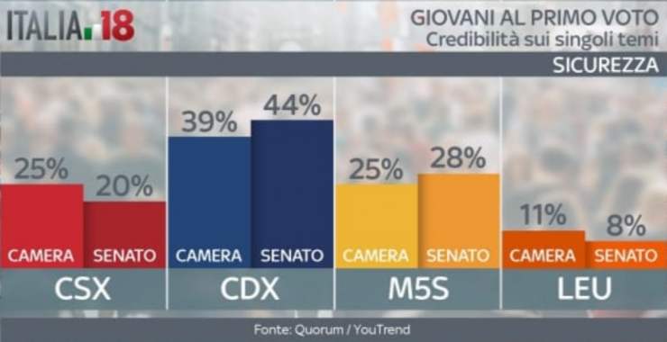 Vediamo ora su alcuni punti chiave quali sono i partiti ritenuti più credibili. Sul lavoro il centrodestra gode di una fiducia leggermente superiore, così come sui temi Europa e politica estera. Dove non c’è partita è sui temi immigrazione e sicurezza: qui l’unica voce credibile sembra essere proprio quella del centrodestra. Il Movimento 5 Stelle invece va molto meglio sulle questioni tasse, scuola e università. Sui costi della politica, poi, sembrano non avere rivali. Sui diritti civili, invece, i giovani hanno opinioni differenti. Quelli al primo voto alla Camera vedono nel centrosinistra l’interlocutore più affidabile. Al contrario, quelli al primo voto al Senato ritengono più credibile il centrodestra. In fondo all’articolo la gallery con tutte le grafiche.