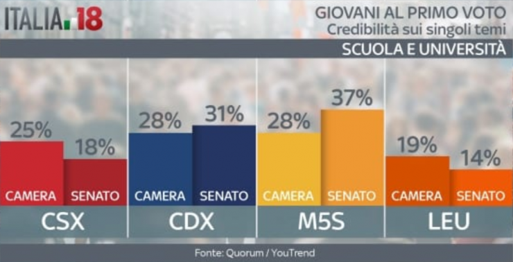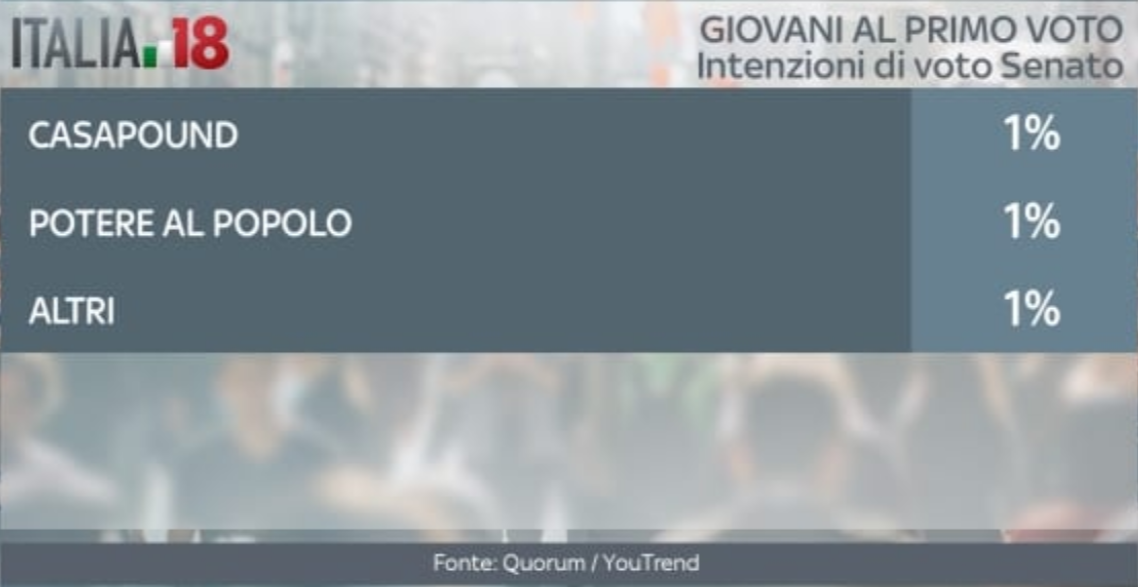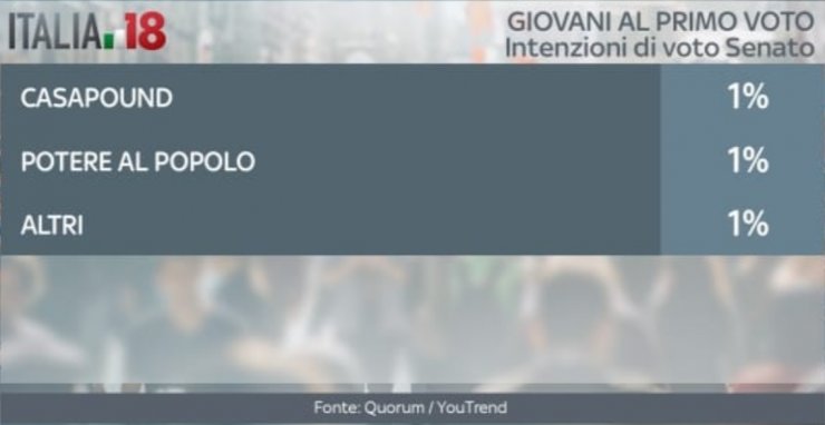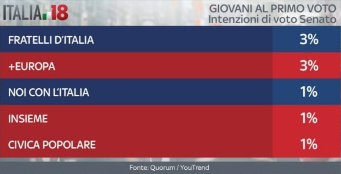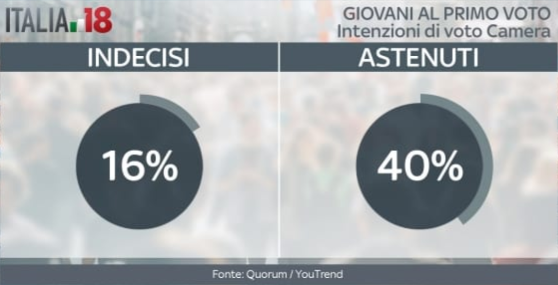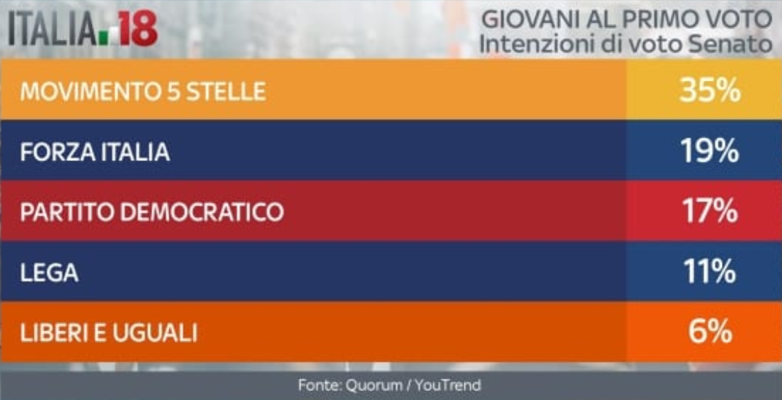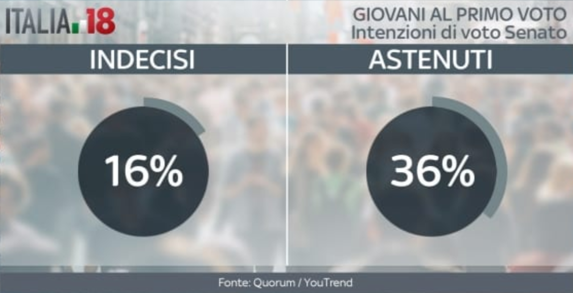 Il Movimento 5 Stelle, poi, va ancora meglio fra i giovani che voteranno per la prima volta per il Senato. Qui la lista capeggiata da Di Maio arriva al 35%. Il Pd scende al terzo posto tra i partiti, con il 17%. Seconda si classifica Forza Italia con il 19%. Il centrodestra al Senato, tra i giovani, non riesce a superare il Movimento 5 Stelle, fermandosi al 34%. Il centrosinistra, invece, va ancora peggio rispetto alla Camera, fermandosi a quota 22%. Gli indecisi rimangono il 16%, mentre diminuisce la percentuale di astenuti, al 36%.