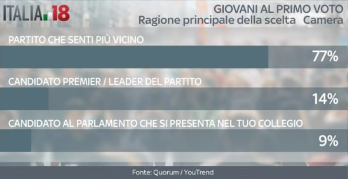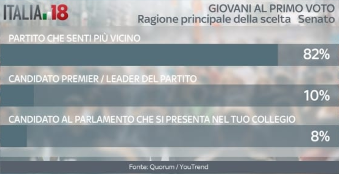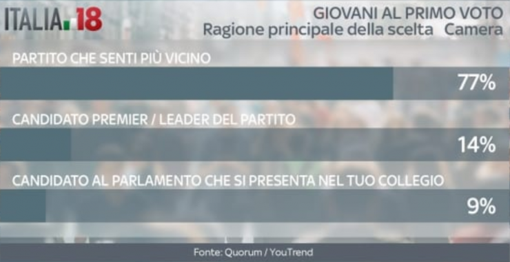 Ma qual è la ragione principale della scelta finale dell’elettore? Sappiamo che con la nuova legge elettorale il nome dei candidato di collegio uninominale potrebbe avere un peso determinante. Ebbene, per il 77% dei giovani al primo voto alla Camera alla fine conterà a quale partito sentono più vicino. Solo il 14% guarderà al candidato premier o leader di partito, mentre solo il 9% si baserà sul candidato del proprio collegio. Percentuali analoghe per i giovani al primo voto per il Senato: qui a scegliere il partito che si sente più affine è addirittura l’80%.