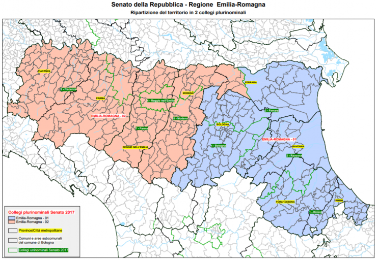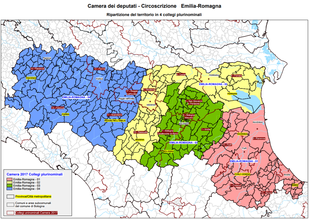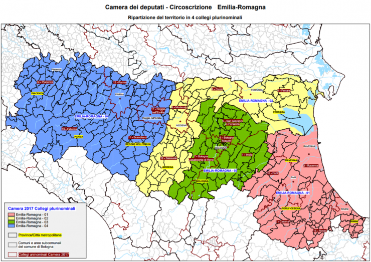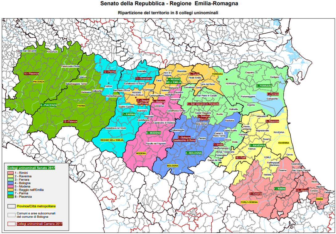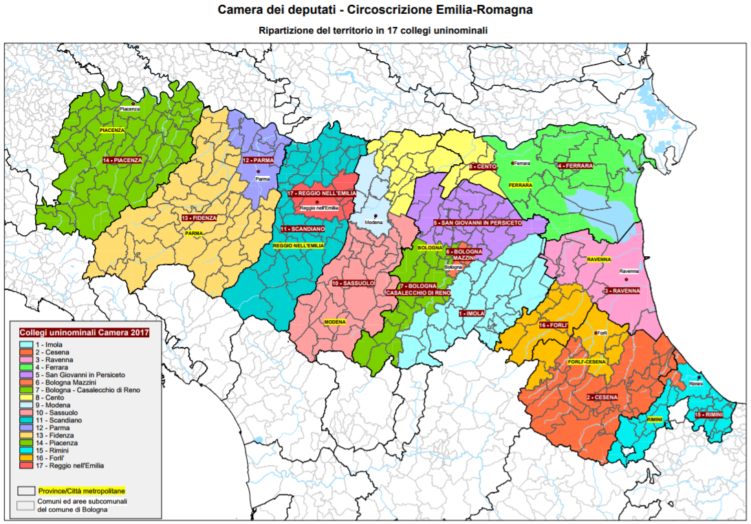 Alla Camera abbiamo 17 collegi uninominali, che rispecchiano grossomodo i confini provinciali, con l’eccezione del collegio di Cento (a scavalco fra bassa modenese e alto ferrarese, senza arrivare a 210.000 abitanti) e di Forlì (che include anche il faentino). I collegi plurinominali sono invece 4 e coprono la Romagna (Ravenna, Forlì-Cesena, Rimini – 7 seggi), Modena-Ferrara (7), Bologna (6), Emilia orientale (Piacenza, Parma, Reggio – 8).