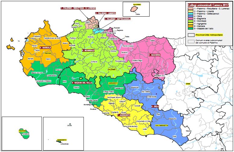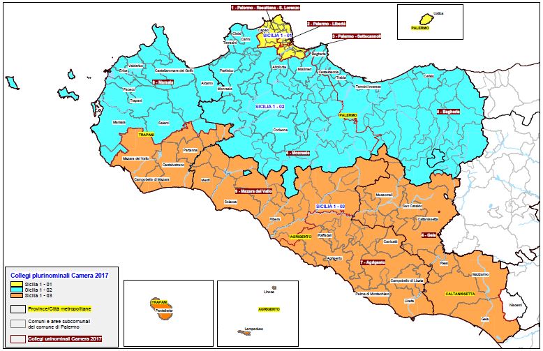 Le mappe dei collegi uninominali e plurinominali della Sicilia (fonte: centro studi Camera)