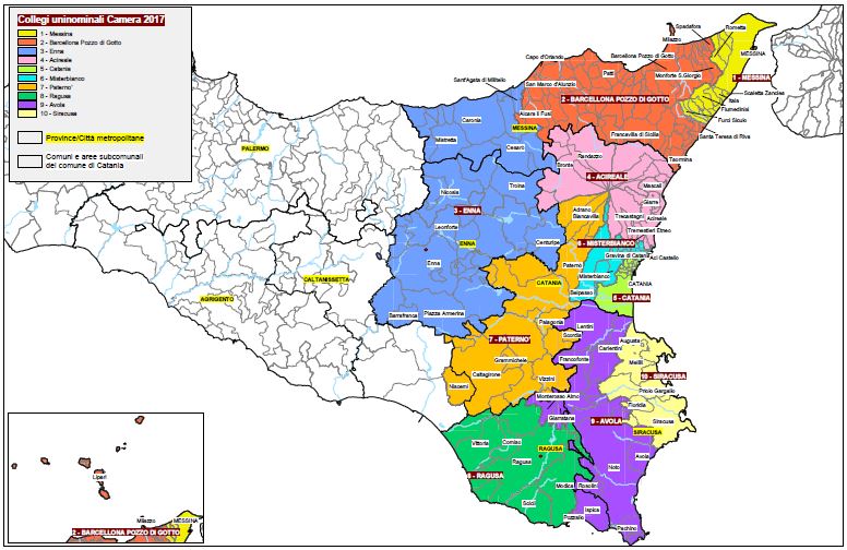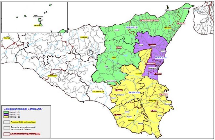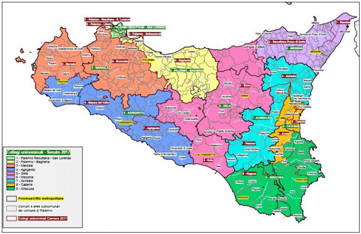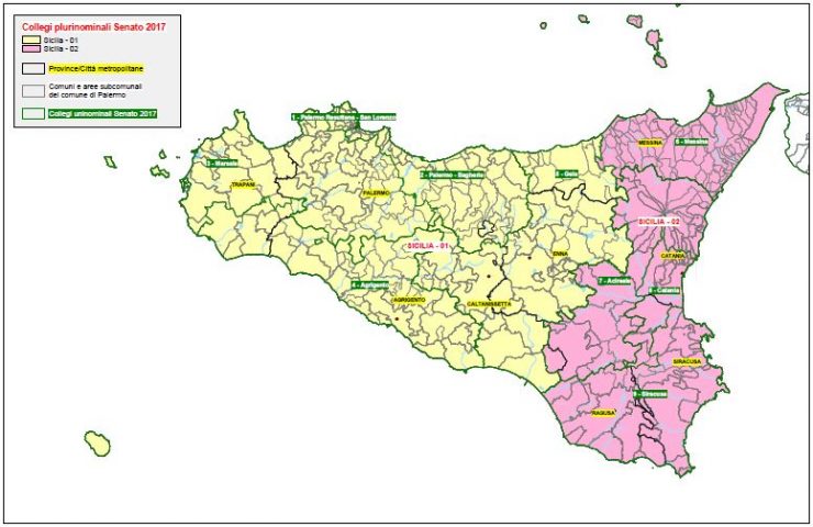Passiamo ora alla suddivisione del territorio della regione in collegi. La Sicilia assegna un totale di 77 seggi così ripartiti: alla Camera dei Deputati 25 seggi per la circoscrizione Sicilia 1, 27 seggi per la circoscrizione Sicilia 2, e 25 seggi al Senato, nell’unica circoscrizione regionale.