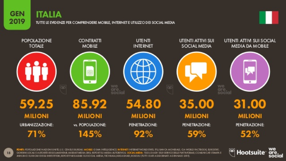 Secondo il Rapporto WeAreSocial 2019, recentemente pubblicato, nel 2018 sono 54,8 milioni gli utenti di internet in Italia, con una penetrazione del 92%: nel giro di un anno sono cresciuti di 11 milioni. Aumentano anche (+2,9%) gli utilizzatori di social media, con un grado di penetrazione del 59%.