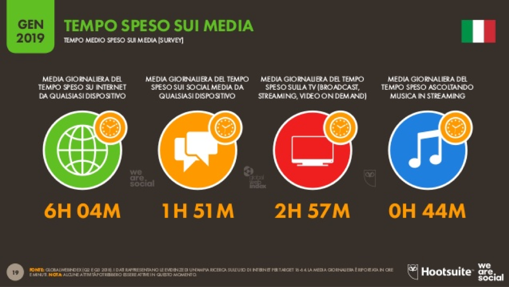 ognuno di noi utilizza questi strumenti mediamente per 6 ore e 4 minuti al giorno. Di queste, 1 ora e 51 minuto sono spesi sui social, quasi tre ore (2:57) sono riservate dalla tv in tutte le sue forme (Broadcast, streaming, video on demand), e una parte minoritaria ma comunque significativa (44 minuti) è assorbita dalla musica in streaming.