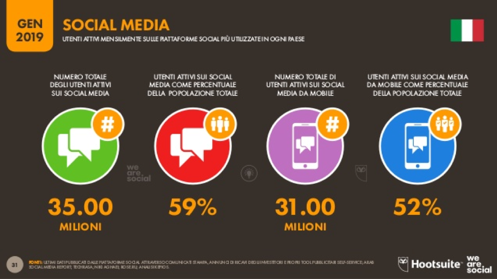 Se è vero che i social sono tra le fonti utilizzate per costruire le proprie opinioni, bisogna capire in che modo riescano a coinvolgere gran parte della popolazione. Oggi infatti sono 35 milioni gli italiani attivi sulle varia piattaforme: 3 su 4 partecipano attivamente e ben 31 milioni ne usufruiscono dai loro dispositivi mobili.