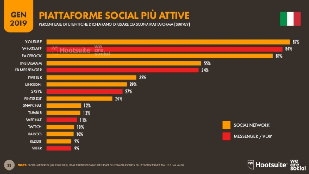 Tra tutte, la piattaforma social maggiormente utilizzata è YouTube, con l’87%, seguita da Facebook (84%). Piuttosto staccato rispetto alle due capoliste troviamo Instagram (55%) e, solo in quarta posizione, Twitter (32%). Non meno importante è il ruolo delle piattaforme di messaggistica, che in molti casi integrano e coadiuvano l’utilizzo dei social. Guida la classifica WhatsApp con l’84%, seguito da Facebook Messenger (54%) e Skype, più staccato con il 27%.