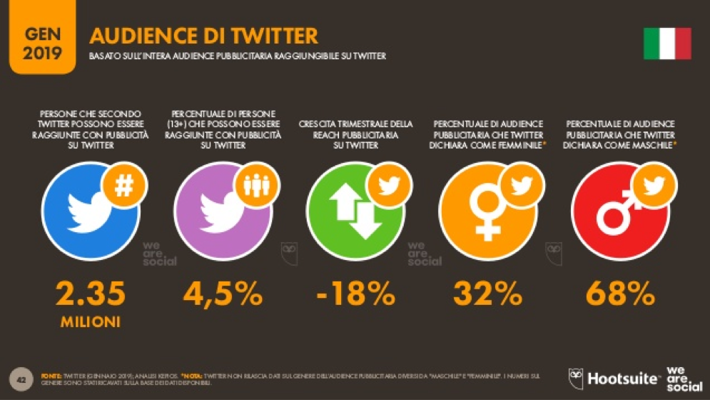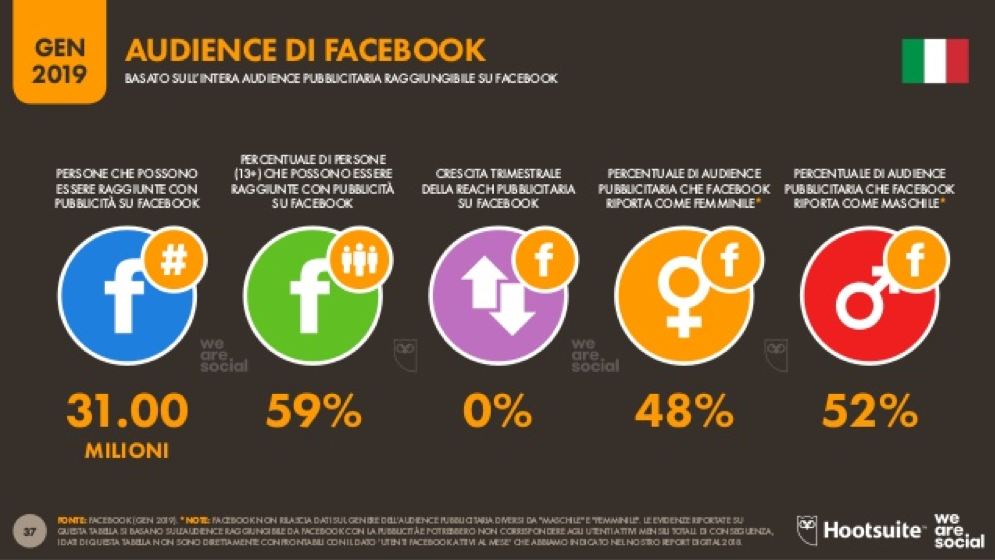 Facebook è uno dei social media più utilizzati in Italia, con ben 31 milioni di utenti attivi al mese. La fascia di età maggiormente presente è quella tra 36 e i 45 anni (21%). Anche se di poco, la piattaforma è più utilizzata dagli uomini (52%) che dalle donne.