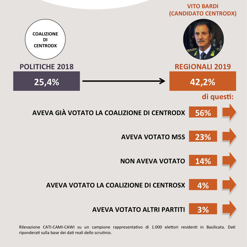 Nel corso dello stesso TG, sono state mostrate anche le stime relative ai flussi di voto nelle recenti elezioni regionali in Basilicata, vinte dal candidato di centrodestra Vito Bardi. Secondo SWG, fatto 100 il 42,2% ottenuto da Bardi domenica scorsa vi è una buona parte (il 56%) di elettori che avevano votato per il centrodestra anche alle Politiche 2018. Ma quasi un quarto dei voti a Bardi (23%) proviene invece da elettori che il 4 marzo 2018 avevano votato per il Movimento 5 Stelle.