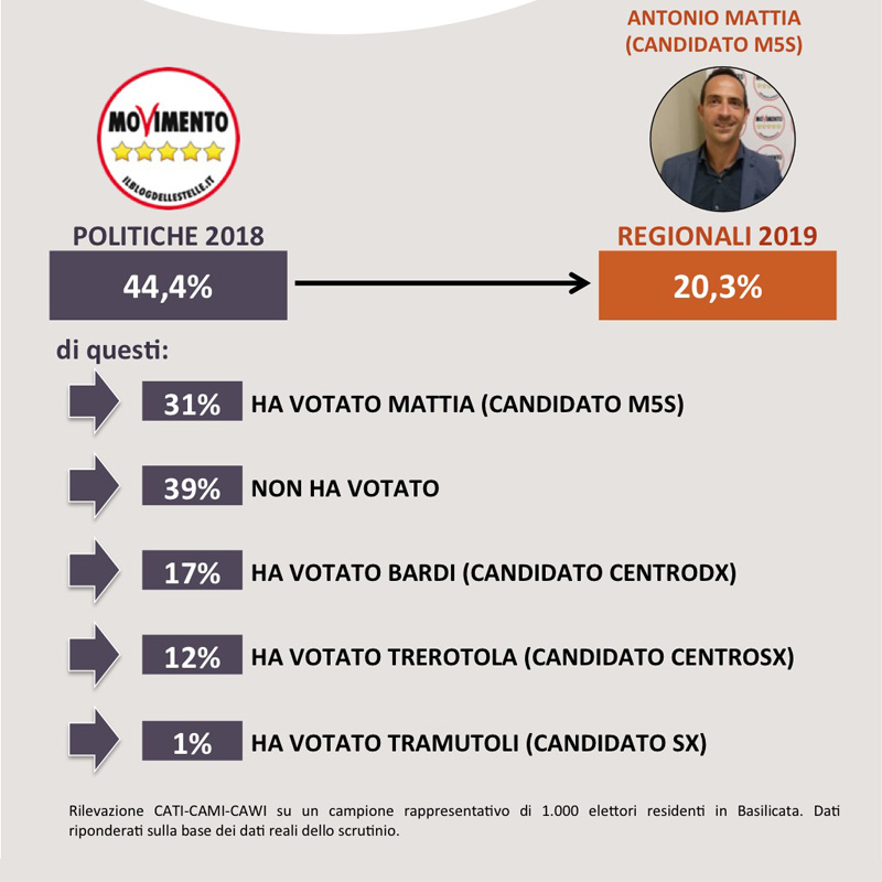 Fin qui i flussi “in entrata”, Interessanti diventano a questo punto i flussi “in uscita” proprio dal Movimento 5 Stelle. Il crollo che ha portato il M5S dal 44,4% delle Politiche in Basilicata al 20,3% raccolto da Antonio Mattia domenica scorsa secondo SWG si spiega col fatto che solo 3 su 10 degli elettori 5 stelle del 2018 hanno confermato il proprio orientamento di voto, mentre la parte maggiore (il 39%) si è rifugiato nell’astensione e un altro 30% si è diviso tra i candidati di centrodestra e centrosinistra Bardi e Trerotola.
