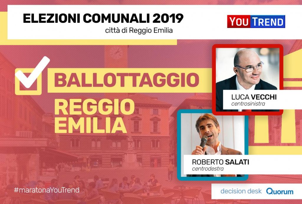 19.00 – Anche a Reggio Emilia, l’esito definitivo della sfida sarà deciso solo al ballottaggio, in cui si sfideranno Luca Vecchi (centrosinistra) e Roberto Salati (centrodestra).