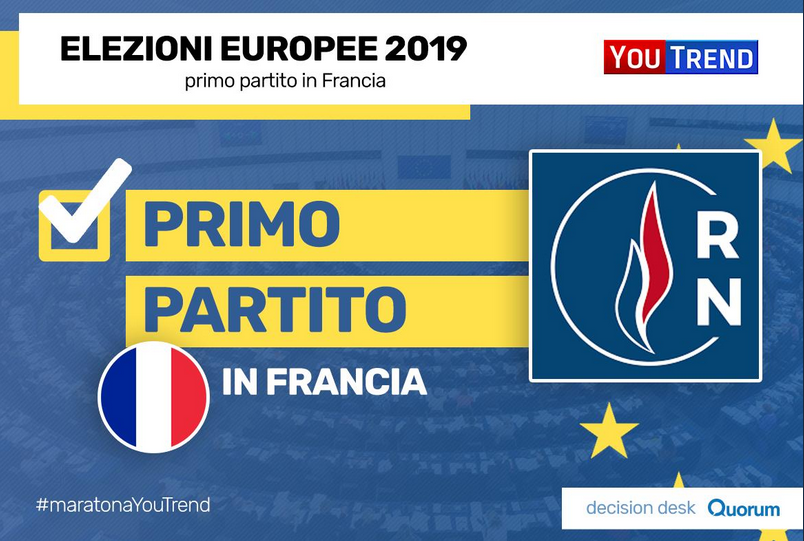 02.11 – In Francia il Rassemblement National di Marine Le Pen è il primo partito alle Europee 2019. Seconda La République En Marche! del presidente Macron.