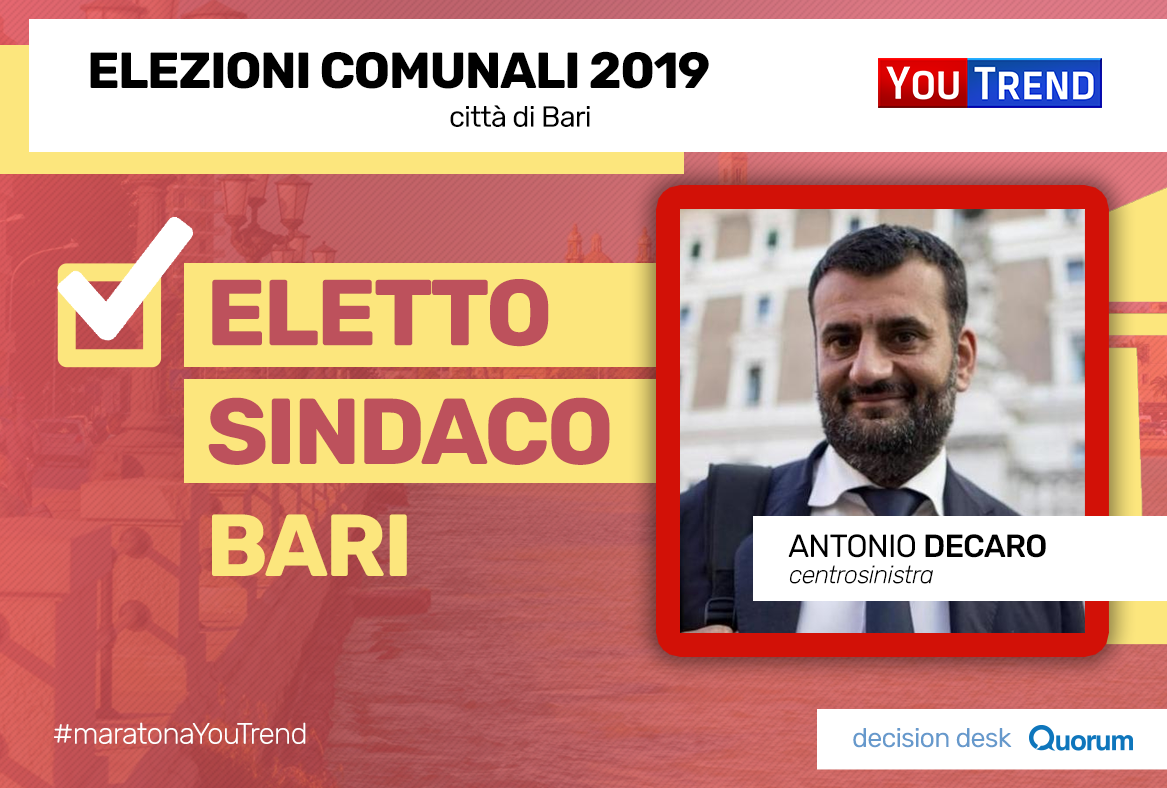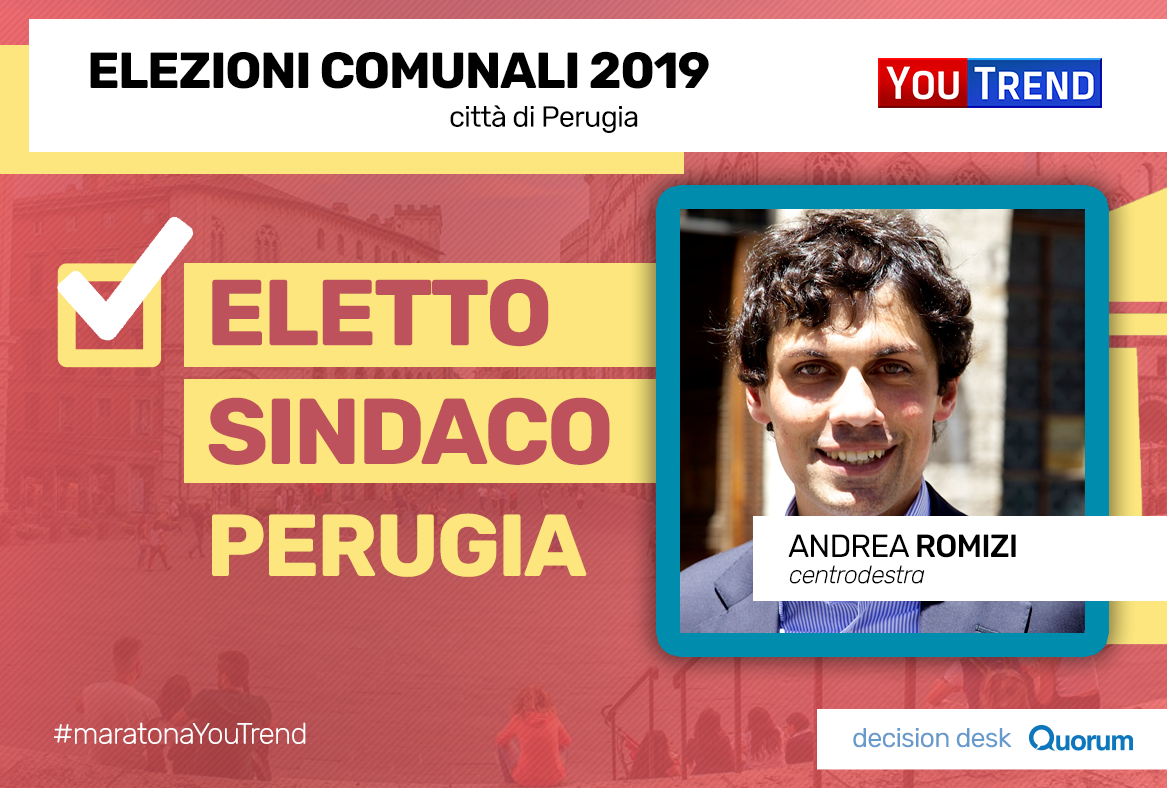 16.42 – Decision Desk Quorum/YouTrend: a Perugia, Andrea Romizi (centrodestra) si riconferma Sindaco, vincendo al primo turno. Anche a Bari, il Sindaco uscente Decaro sconfigge al primo turno lo sfidante Pasquale Di Rella e si assicura un altro mandato.