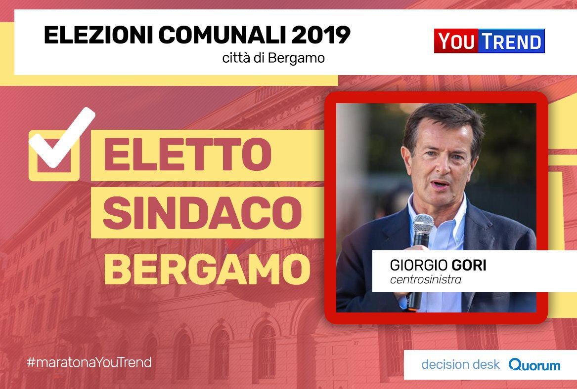 16.20 – Decision Desk Quorum/YouTrend: Giorgio Gori si riconferma Sindaco di Bergamo, battendo, al primo turno, lo sfidante di centrodestra Giacomo Stucchi. Negli ultimi 24 anni mai era accaduto che un incumbent venisse riconfermato nella città lombarda, che aveva visto alternarsi, da ben 25 anni, amministrazioni di centrodestra ad amministrazioni di centrosinistra.