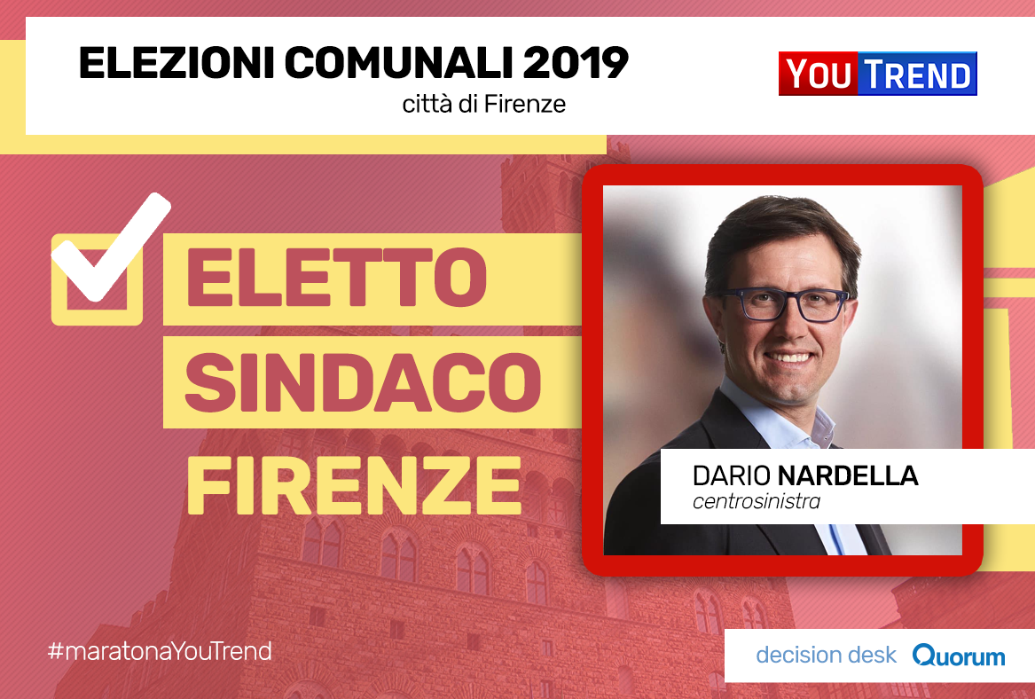 16.59- Decision Desk Quorum/YouTrend: Dario Nardella si riconferma Sindaco di Firenze, vincendo per la seconda volta di fila al primo turno e prevalendo sullo sfidante, Ubaldo Bocci.