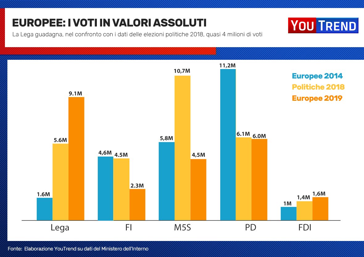 Nella seconda grafica, invece, abbiamo confrontato i voti assoluti ottenuti dai partiti tra le Europee del 2014 e oggi. Interessante notare come il Partito Democratico, in realtà, non abbia ottenuto, nella giornata di ieri, più voti che in passato, anzi: rispetto alle Politiche del 2018, il partito di Zingaretti ha registrato un calo di 100 mila voti. Netta la crescita della Lega, che nell’arco di quattro anni ha guadagnato ben 7,5 milioni di preferenze. Flessione, invece, per il Movimento 5 Stelle, tra le scorse Politiche e le elezioni di ieri (-6,2 milioni)
