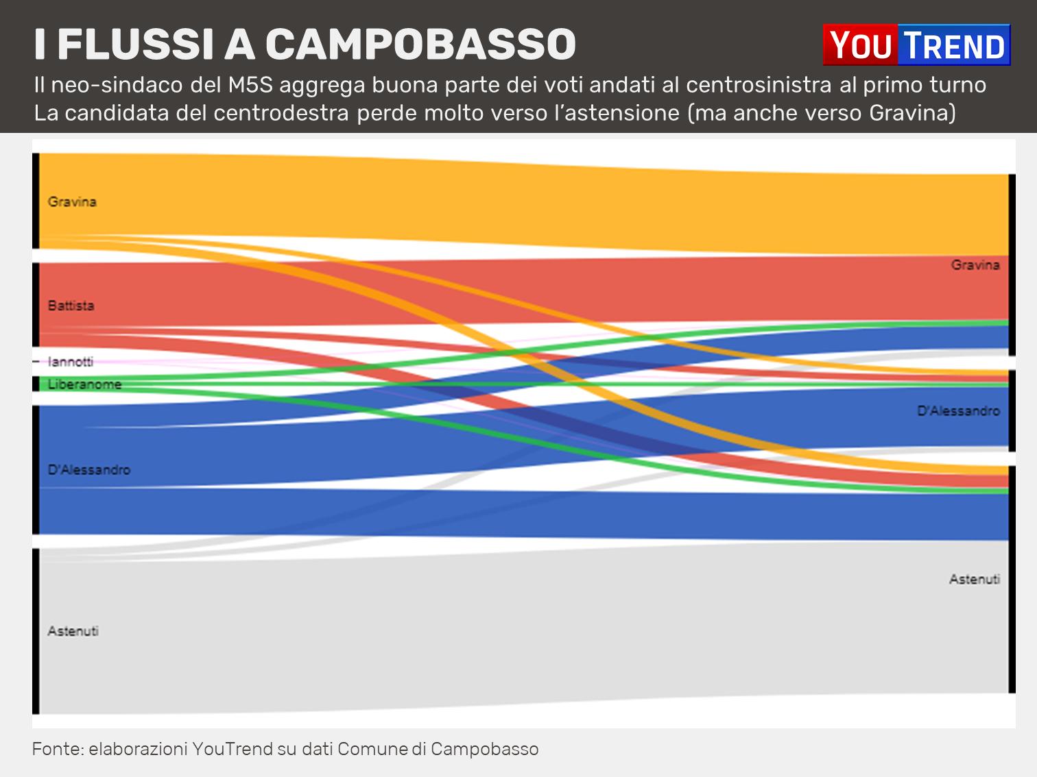 Il capoluogo del Molise è l’unico comune italiano vinto al ballottaggio dal Movimento 5 Stelle. Tuttavia, il candidato pentastellato Roberto Gravina al primo turno era in svantaggio rispetto alla candidata del centrodestra unito Maria Domenica D’Alessandro: se si vanno ad analizzare i flussi, si può osservare come più della metà degli elettori che al primo turno hanno votato il Sindaco uscente di centrosinistra Antonio Battista si sono spostati al secondo turno sul candidato pentastellato, che ha quasi raddoppiato i voti rispetto al 26 maggio ed ha quindi potuto vincere.