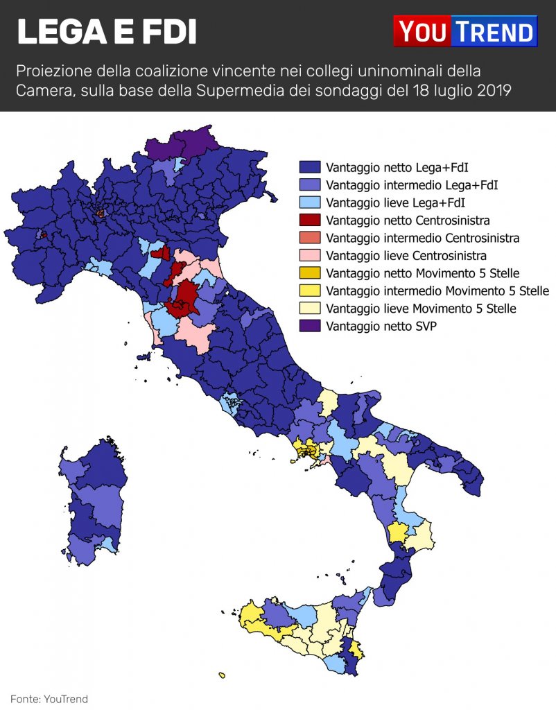 Osservando la mappa dei collegi uninominali, si nota quanto l’assenza di Forza Italia possa incidere nel Centro-Sud e del Sud: senza il partito di Berlusconi, infatti, l’asse Salvini-Meloni si fermerebbe ad “appena” 176 collegi su 230, e non sarebbe in grado di sfondare nelle aree di forza del M5S (che vincerebbe così in 31 collegi), a partire dalla Sicilia. Più simile al precedente, invece, il quadro del centrosinistra (23 collegi vinti). Il Partito Democratico recupererebbe però alcuni collegi importantissimi, come quelli dell’area urbana di Milano e di Torino.
