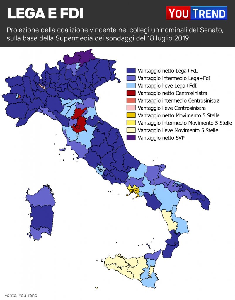 Al Senato, la situazione sarebbe simile: Lega e Fratelli d’Italia vincerebbero in 93 collegi uninominali, il Movimento 5 Stelle in 14 e il centrosinistra in 7. Si notano però alcune piccole differenze rispetto alla Camera. A causa della diversa conformazione dei collegi, l’asse Lega-FdI sarebbe capace di vincere in più aree del Centro-sud e del Sud, della Toscana e dell’Emilia-Romagna.