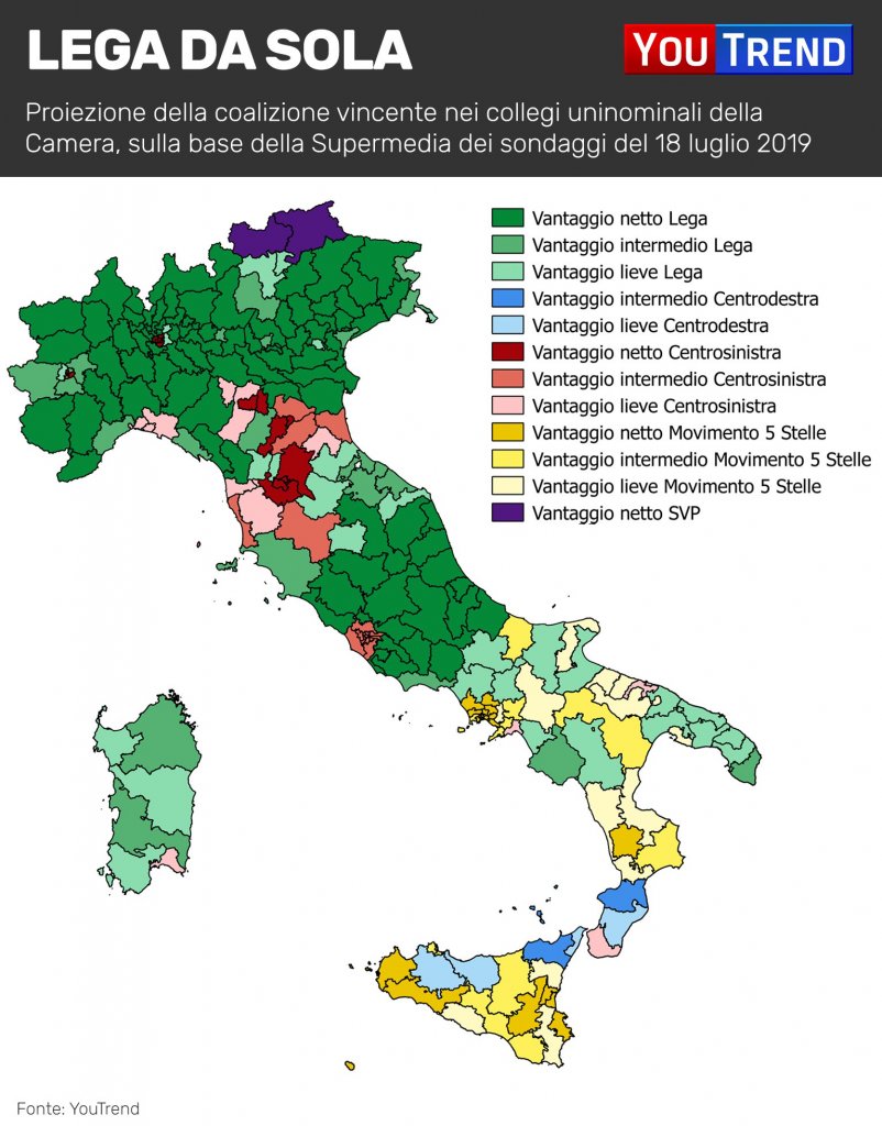 Le mappe dei collegi mostrano come questo sia uno scenario decisamente più combattuto, sia alla Camera che al Senato. Il predominio della Lega nel Centro-Nord (dal Lazio in su) sarebbe netto, con poche “isole rosse” limitati alle zone urbane di Roma, Milano e Torino e ad alcuni collegi in Toscana ed Emilia-Romagna. Al Sud la sfida con il Movimento 5 Stelle sarebbe serrata, e quasi tutti i collegi sarebbero in bilico: in alcuni casi sarebbe competitivo sia il centrosinistra sia addirittura (in Calabria e Sicilia) il “centrodestra ridotto” FI-FdI.