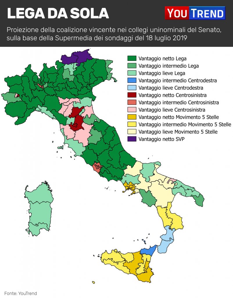 Anche al Senato il partito di Matteo Salvini si fermerebbe ben al di sotto della maggioranza assoluta, con 142 seggi su 309. In entrambe le Camere, però, il centrodestra sarebbe comunque in grado di formare un Governo con un accordo post-elettorale tra i 3 partiti.