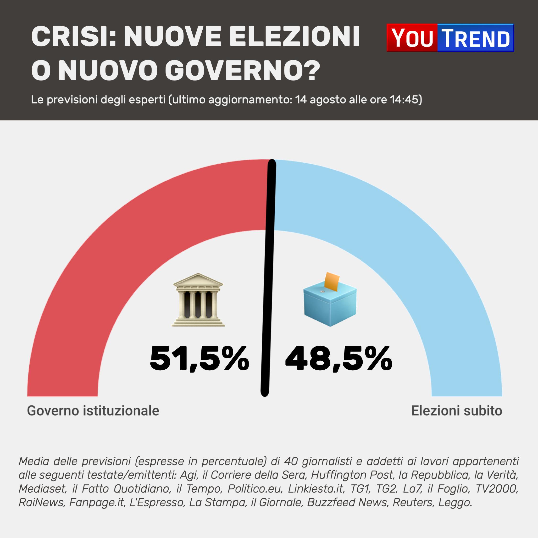 Fra ieri e oggi abbiamo condotto una expert survey sulla crisi di governo, chiedendo l’opinione di giornalisti e addetti ai lavori di ben 26 testate. Nell’ultimo aggiornamento del survey di poche ore fa, fra elezioni anticipate e un governo istituzionale sembra prevalere (di misura) il secondo: