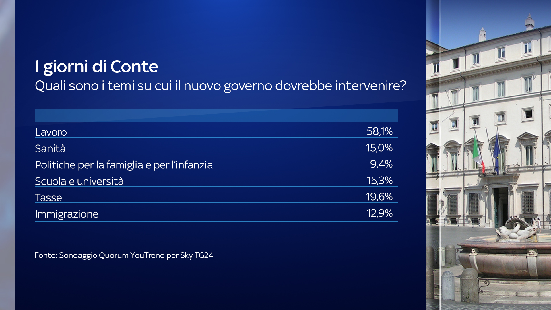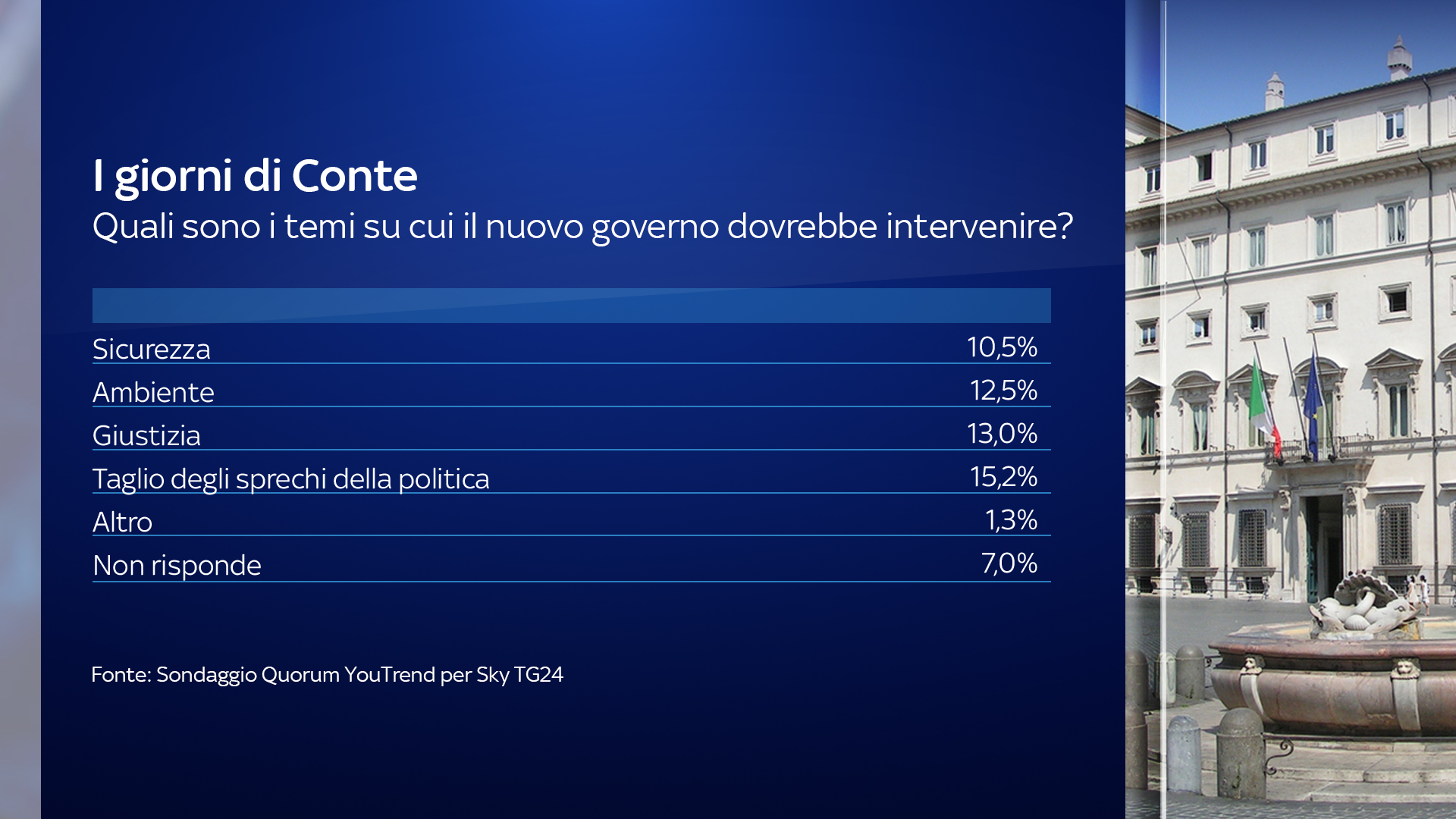 Il tema di gran lunga prioritario per il nuovo governo è il lavoro (58%), seguito dalle tasse (20%). In secondo piano scuola e università (15%), sprechi della politica (15%), sanità (15%), giustizia (13%), immigrazione (13%). Significativo notare come ambiente, una delle tematiche chiave del nuovo Governo, si stanzi solo al 12,5%, davanti a sicurezza (10,5%), ma dietro all’immigrazione (12,9%)
