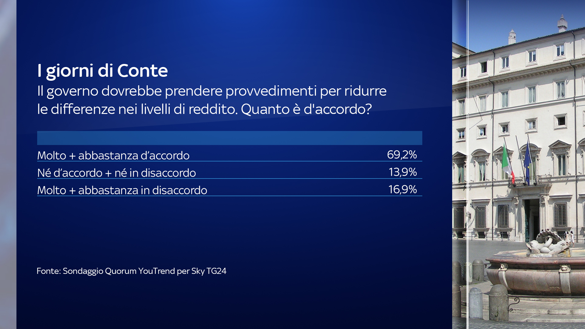 La nuova alleanza di Governo ha parlato più volte della necessità di diminuire le diseguaglianze, per una maggiore equità, anche di reddito. Il 69,2% dei cittadini si dice assolutamente d’accordo con l’esigenza di intervenire, mentre appena il 16,9% è contrario.