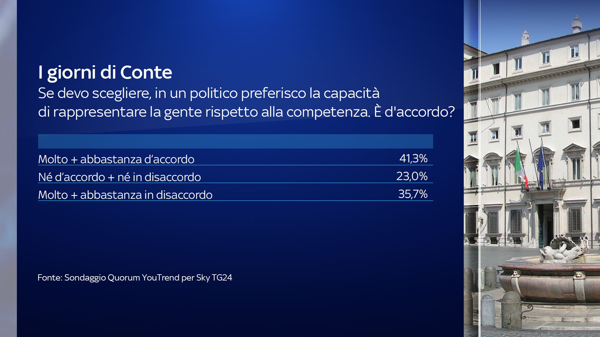 Infine, una domanda sulle qualità che deve avere un personaggio politico: saper rappresentare la gente o essere competente? Il 41,3% è complessivamente propenso a scegliere un profilo che sappia portare le posizioni dei cittadini nelle istituzioni, anche sacrificando l’aspetto della competenza.