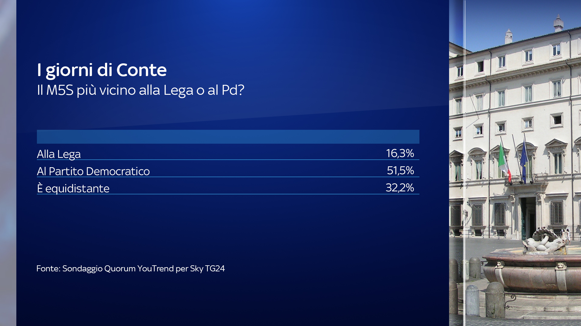 A lungo si è discusso, a partire dal giorno successivo alle elezioni politiche di marzo 2018, rispetto al fatto che il Movimento 5 Stelle avesse più punti in comune con la Lega o con il Partito Democratico. I cittadini non sembrano però avere grandi dubbi: la maggiorana assoluta (51,5%) crede che le affinità maggiori siano con il Partito i Nicola Zingaretti, il 16,3% con la Lega Nord; per il 32,2% è equidistante.