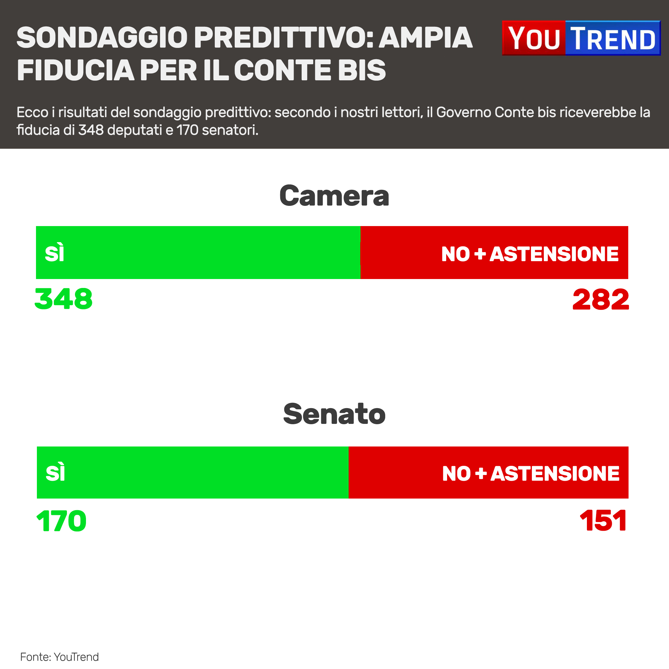 A Palazzo Madama, dove siedono 315 senatori eletti più 6 a vita, la media delle risposte al sondaggio predittivo è 170, a fronte di una maggioranza fissata a quota 161. Ricordiamo però che la somma delle tre forze politiche espressamente rappresentate nel nuovo Esecutivo è pari a 162 senatori (i pentastellati sono 107, i democratici 51 e i rappresentanti di LeU 4).