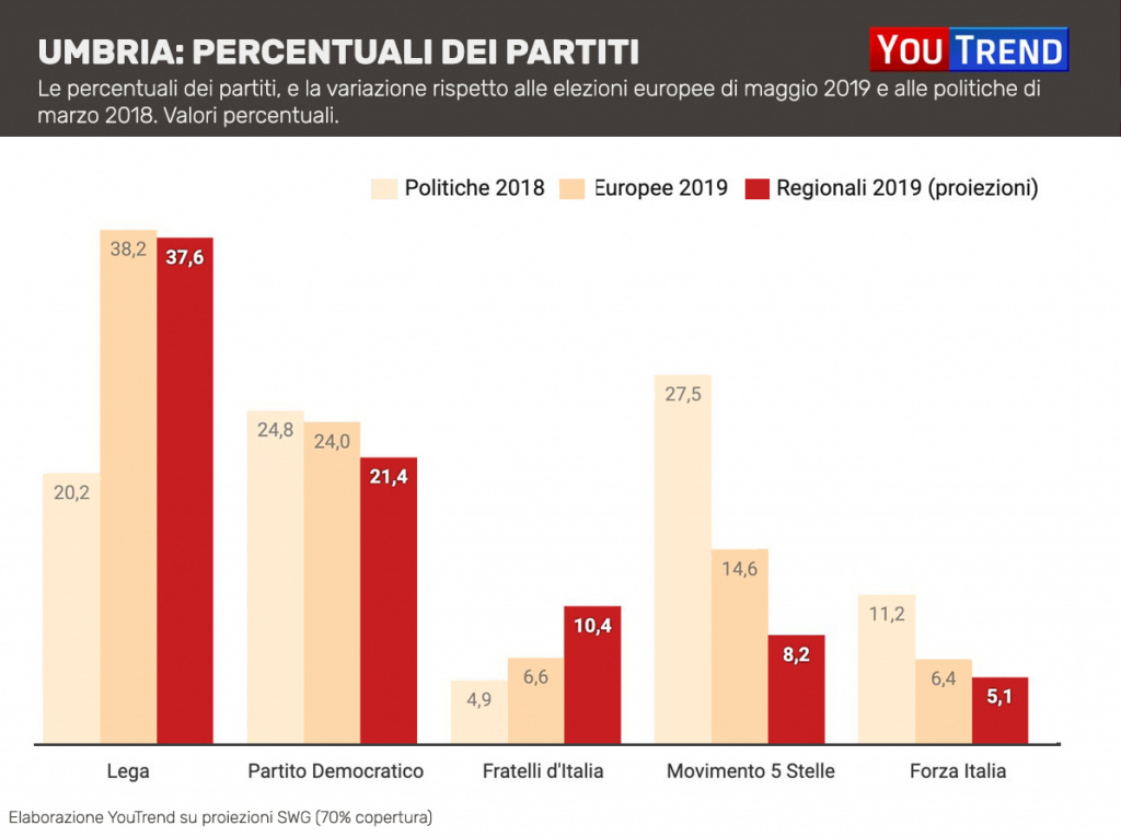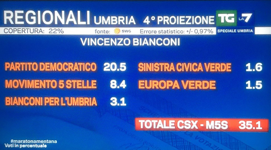 Ore 00.24 – Intanto giungono le prime reazioni anche da esponenti del Partito Democratico. Così Andrea Marcucci, capogruppo al Senato per il partito di Nicola Zingaretti: “Una sconfitta evidente, che non avrà conseguenze sul governo, ma impone una riflessione ben più approfondita sulle alleanze. Il matrimonio tra Pd e M5S in Umbria mette in evidenza tutti i limiti di alleanze costruite all’ultimo minuto e senza contenuti.”