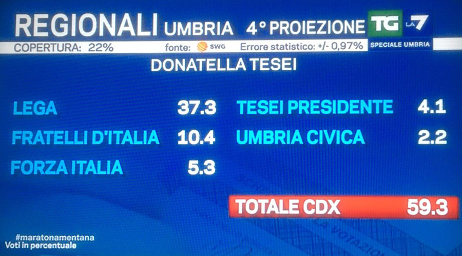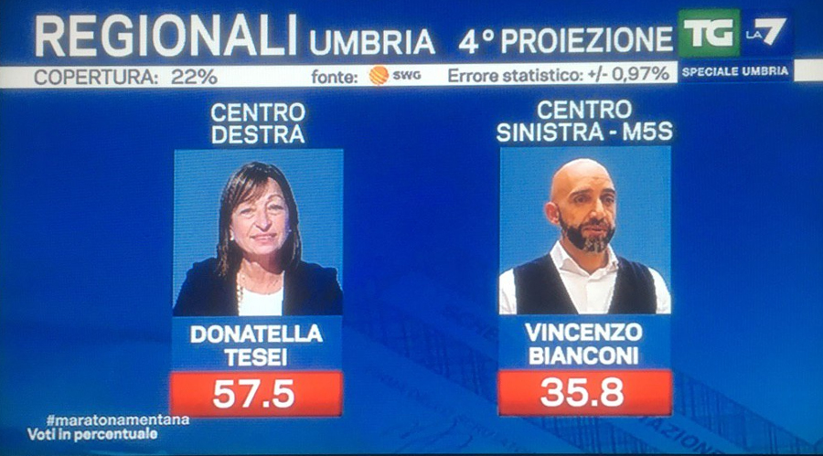 Ore 00.23 – Nuovo aggiornamento anche dalle proiezioni SWG (copertura del 15%), che attesta Donatella Tesei al 58,2%, mentre Vincenzo Bianconi si fermerebbe al 35,5%.