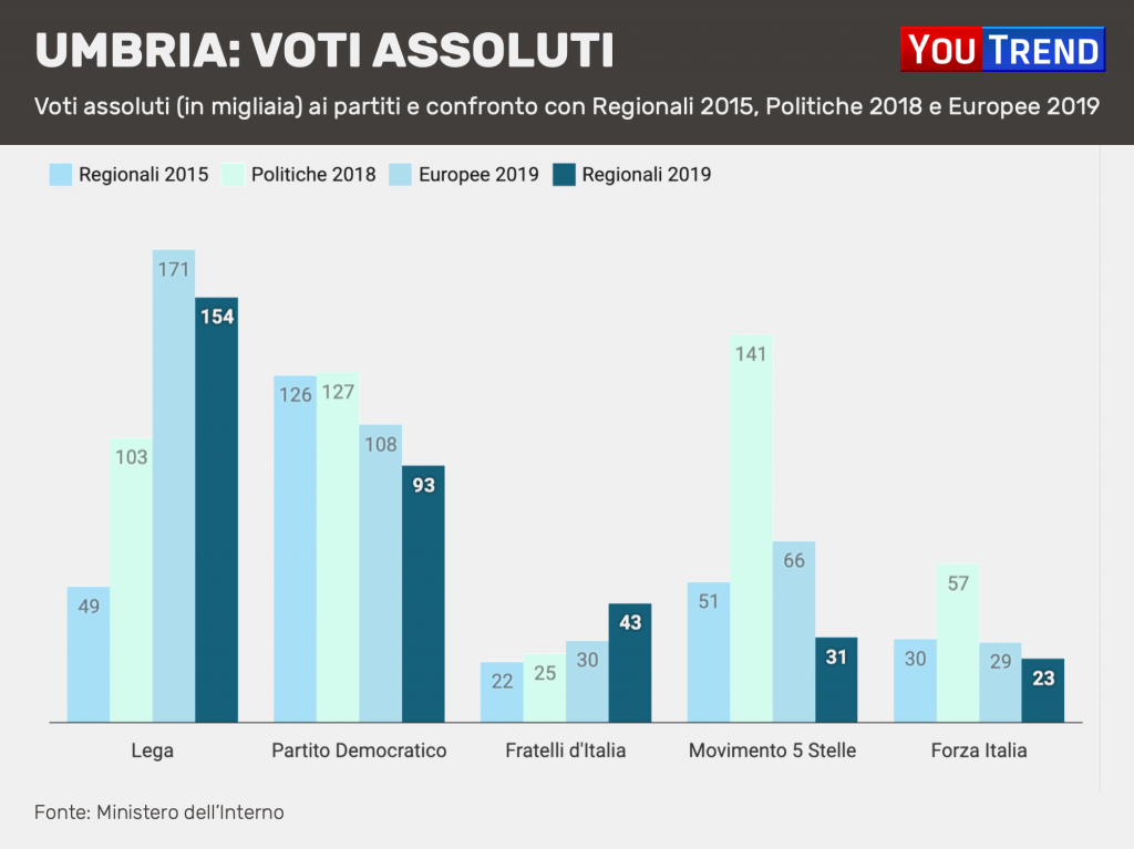 Ore 9.15 – Confronto con le precedenti Regionali (2015) e con le Politiche 2018 e le Europee 2019, anche stavolta sia in termini di percentuali che di voti assoluti. L’unico partito a guadagnare in termini assoluti rispetto alle Europee di maggio è Fratelli d’Italia (+13 mila voti).