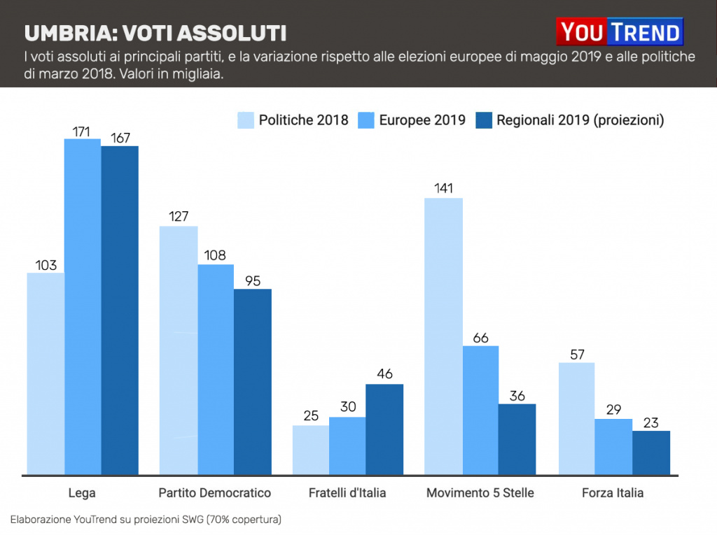 Ore 2.40 – Chiudiamo questa diretta con una prima elaborazione dei voti assoluti, basata sulle proiezioni di SWG (copertura 70%). La Lega perde leggermente, in termini di voti, rispetto alle elezioni europee, ma guadagna circa 65 mila votanti rispetto alle politiche 2018. In netto calo PD e M5S, mentre Giorgia Meloni ha visto passare i sostenitori di FdI da 25 mila (2018) a 46 mila.