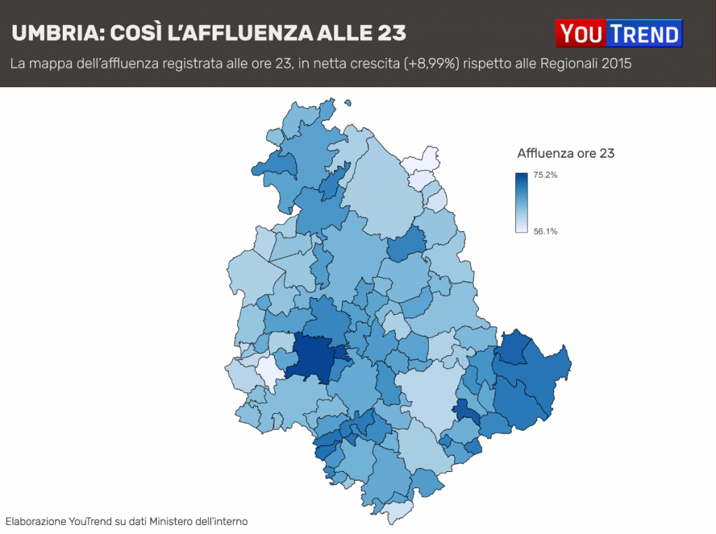 Ore 1.15 – Guardando al livello provinciale, la candidata di centrodestra Donatella Tesei sembra andare meglio in Provincia di Perugia (60,3%) che in Provincia di Terni (55,2%). Al contrario Vincenzo Bianconi va meglio nella Provincia di Terni (40,6%) che in quella di Perugia (34,9%).