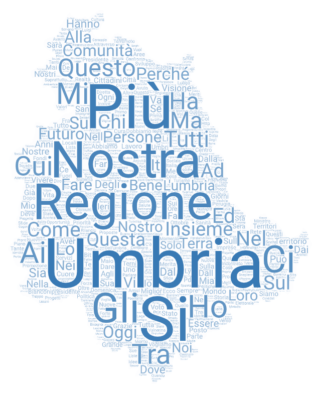 L’analisi lessicale dei post mostra come vi sia una piattaforma di parole comuni usate da entrambi i candidati. La parola “Umbria” riveste ovviamente il ruolo di protagonista, ed è stata usata ben 65 volte nei post dei due candidati principali. Le altre parole usate con più frequenza sono “Regione” (57), “Nostra” (57), “Insieme” (33), “Comunità” (30) e “Persone” (27).