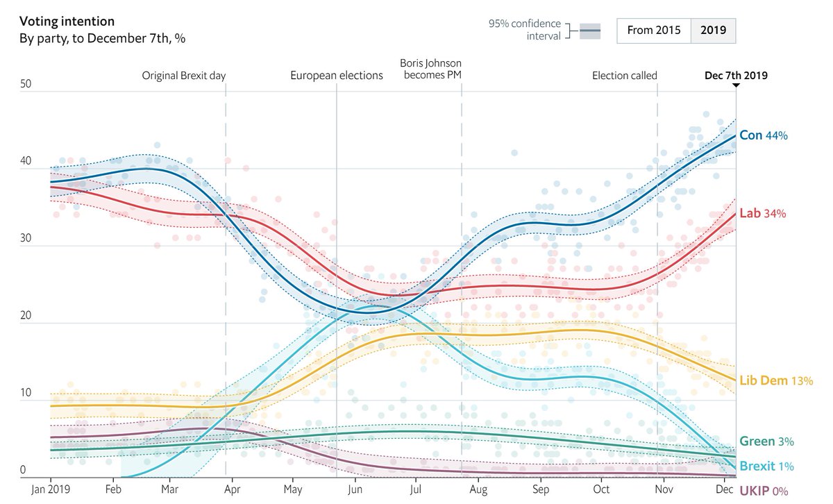 Potremmo parlare di un riallineamento sulle posizioni storiche. Se a giugno c’erano 4 partiti in un range di 6 punti (Labour, Brexit Party, Conservatives e Liberal Democrats), ora invece si assiste a una nettissima tendenza alla bipolarizzazione: Conservatori e Laburisti insieme sono quasi all’80%, i LibDem tornano a un  fisiologico 13% e il partito di Nigel Farage quasi scompare.