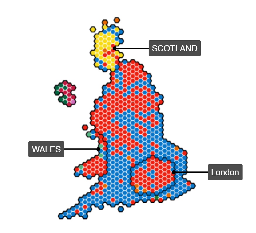 La mappa qui sopra sovrarappresenta i collegi vasti ma poco popolosi (es. quelli della Scozia, in giallo) e al contrario sottorappresenta Londra e le aree urbane. Per questo motivo, si utilizza anche quest’altra versione, che dà a tutte le constituency la stessa dimensione rappresentandoli come esagoni.