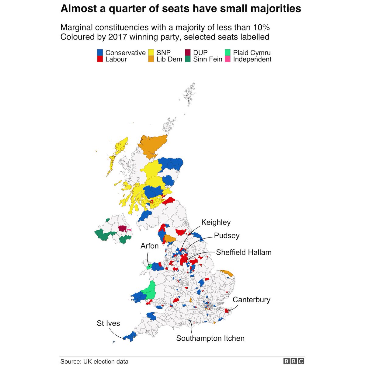 Per questa ragione i partiti a inizio campagna elettorale costruiscono mappe e modelli statistici per identificare i “marginal seats“, quei collegi in cui si vince o si perde per pochi voti.