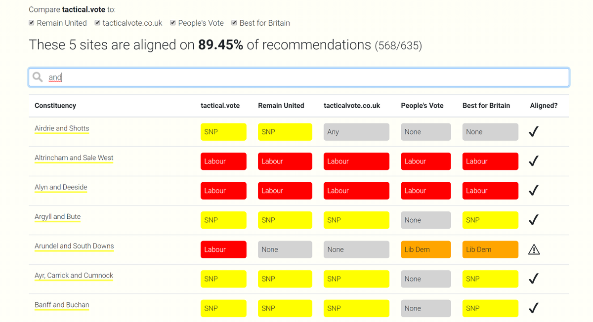 Negli ultimi anni c’è stata un’esplosione di siti che danno indicazioni sul tactical voting, soprattutto da parte di attivisti e comitati anti-Brexit che cercano di unire le forze contro i Conservatori: ad esempio Best for Britain, People’s Vote, TacticalVote, Remain United. Esistono anche degli aggregatori come votetools che permette di fare una comparazione tra i voti tattici suggeriti dai vari siti.