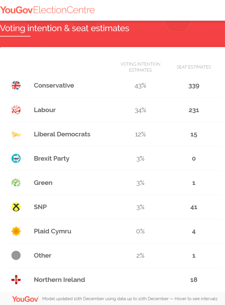 La stima nazionale di YouGov, basata sulla somma delle probabilità collegio per collegio elaborata con l’MRP, è al momento questa. Sarebbe una vittoria di misura per Boris Johnson, ma rispetto alla prima stima pubblicata il 27 novembre la maggioranza Tory è diminuita da 68 a 28 seggi, quindi il trend è nettamente in calo e non si può sapere cosa succederà domani.