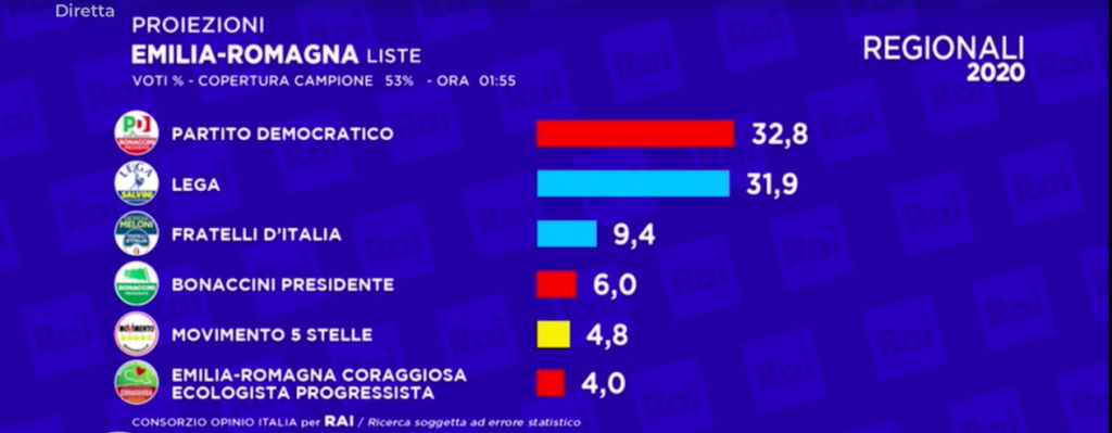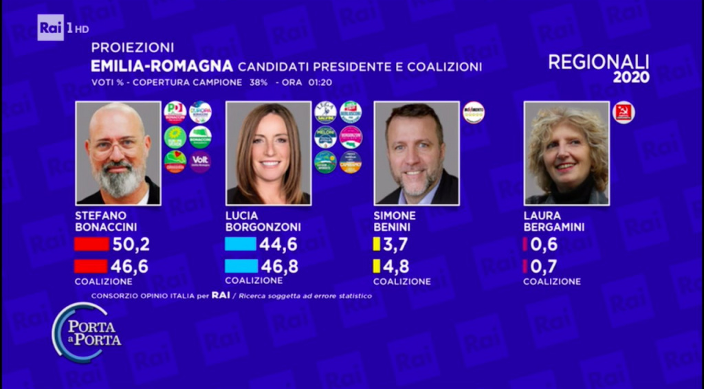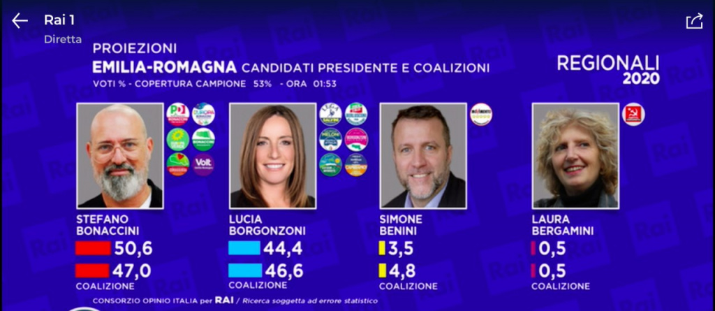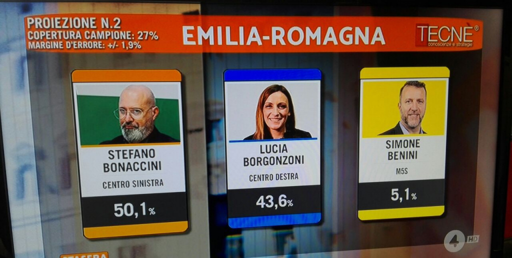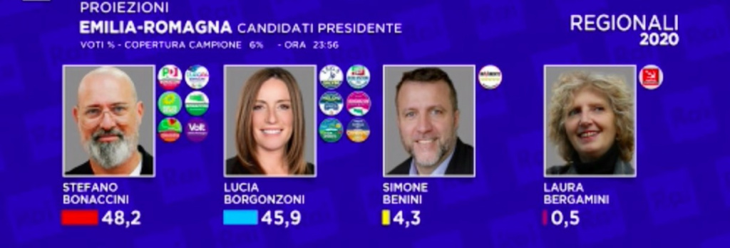 Ore 1.39 – Le nostre analisi, giunti a questo punto della serata, ci danno una certezza. Stefano Bonaccini è stato confermato Presidente della Regione Emilia Romagna.