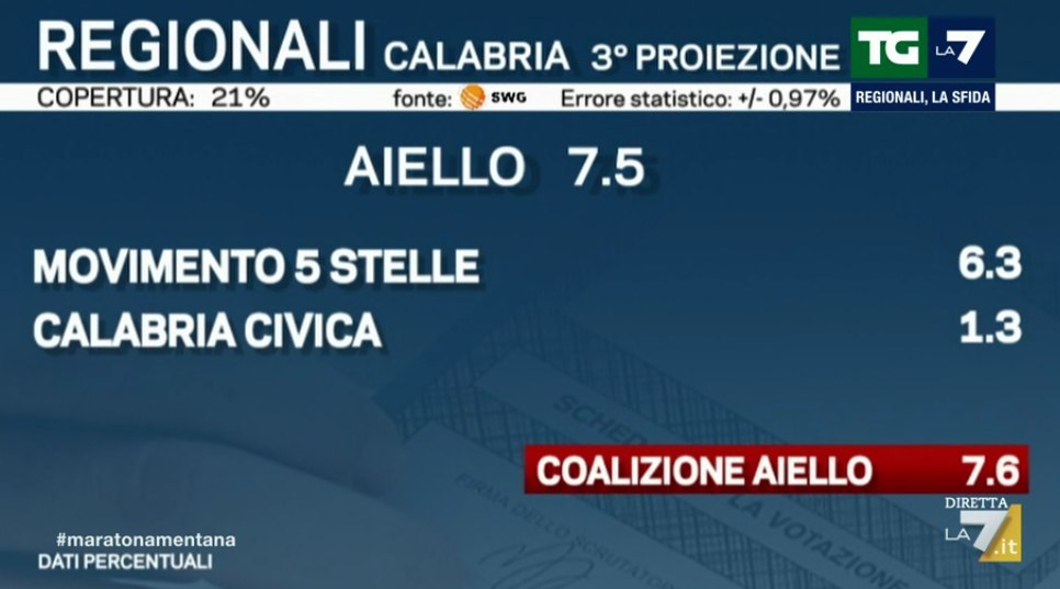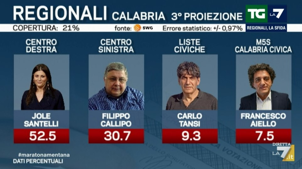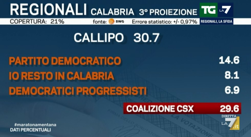 Ore 01.19 – Torniamo un attimo in Calabria, dove la candidata del centrodestra Jole Santelli è stata eletta Presidente. Come vediamo dalla terza proiezione di SWG per La7, il suo vantaggio sul candidato del centrosinistra sarebbe di ben 22,5 punti.