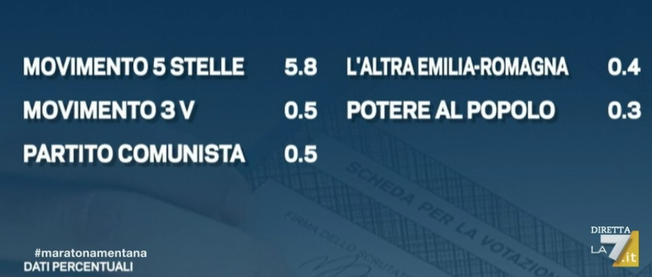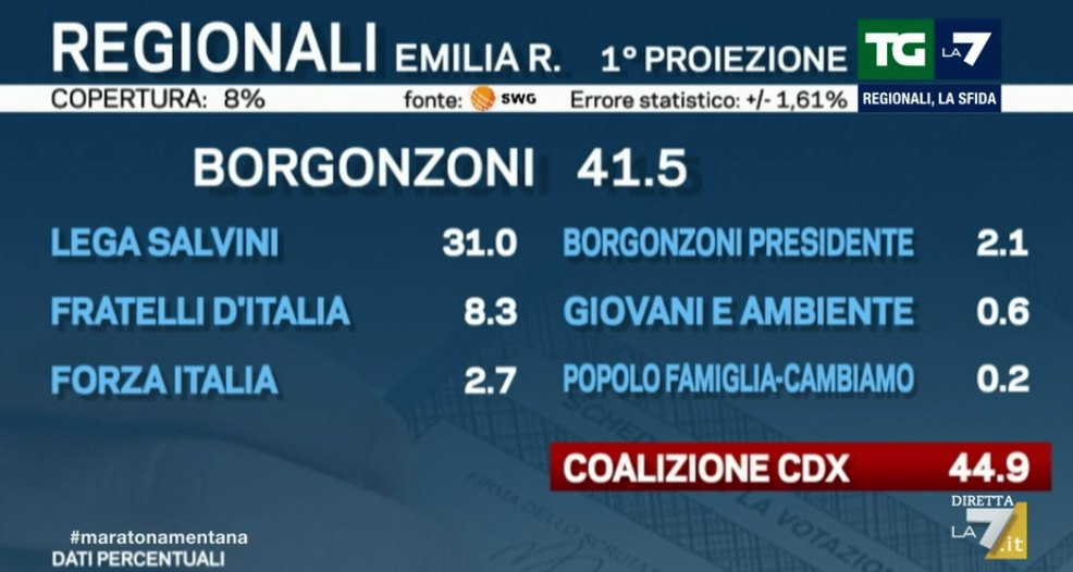 Ore 23.58 – In Emilia Romagna, secondo le proiezioni di SWG per La7, si delineerebbe un testa a testa tra Partito Democratico e Lega per il ruolo di primo partito.