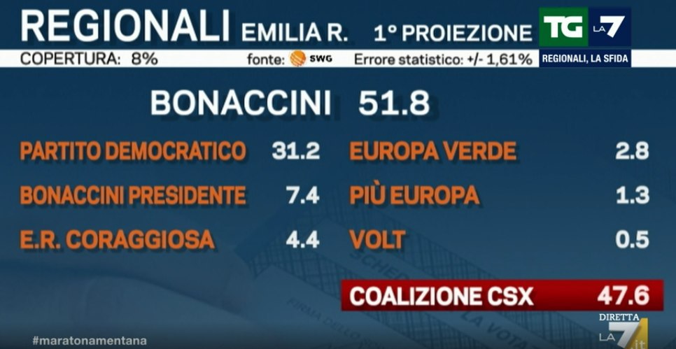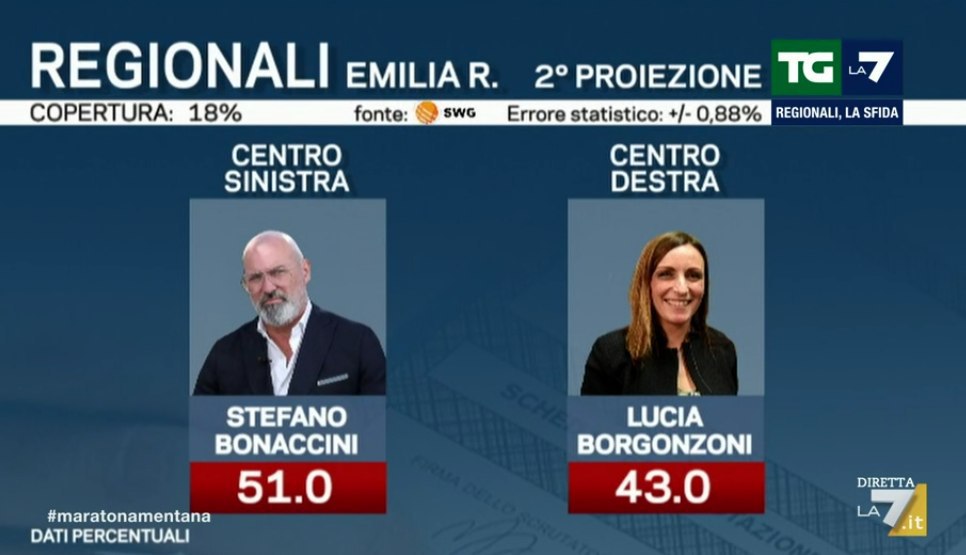 Ore 00.44 – Seconda proiezione SWG, che conferma i circa 8 punti di distacco tra Stefano Bonaccini (centrosinistra) e Laura Bergonzoni (centrodestra).