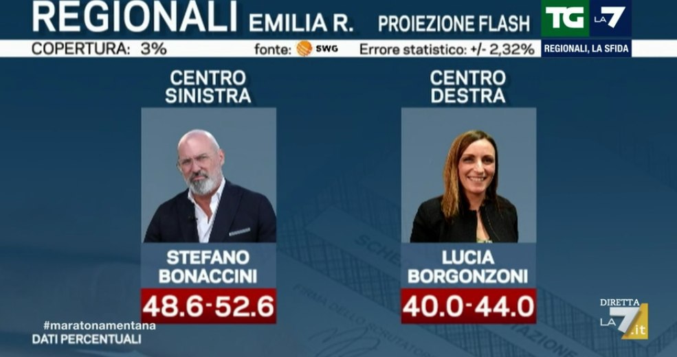 Ore 00.01 – Abbiamo le prime proiezioni del Consorzio Noto per la Rai e di Tecnè per Mediaset: il vantaggio di Stefano Bonaccini (Pd) sarebbe del 2,3% nel primo caso, e del 4,5% per Tecnè, molto più contenuti rispetto a quelli rilevati in precedenza da SWG.